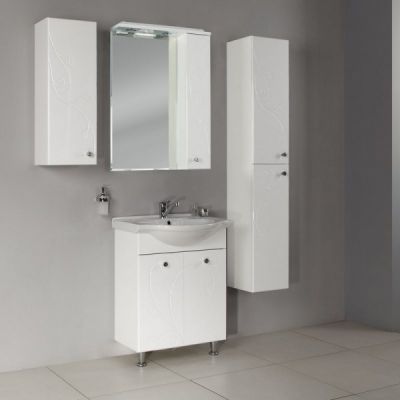 Набор мебели Акватон Лиана 60 - ОписаниеМебель Акватон Лиана 60 выполнена в универсальном дизайне и по своим размерам подходит для небольших ванных комнат. Изящные вьющиеся линии, украшающие фасады мебели, принесут в ванную природные мотивы, а организация внутреннего пространства позволят разместить все необходимое. Установка мебели очень простая и удобная – напольная, не требующая никаких особых креплений. Дверцы оснащены стабилизаторами для более плавного закрытия, а зеркало имеет дополнительную, приятную для глаз, подсветку. Что же касается раковины, то она изготовлена из санитарного фаянса – материала, который не вызывает сомнений в своей качестве, гигиеничности и долговечности.