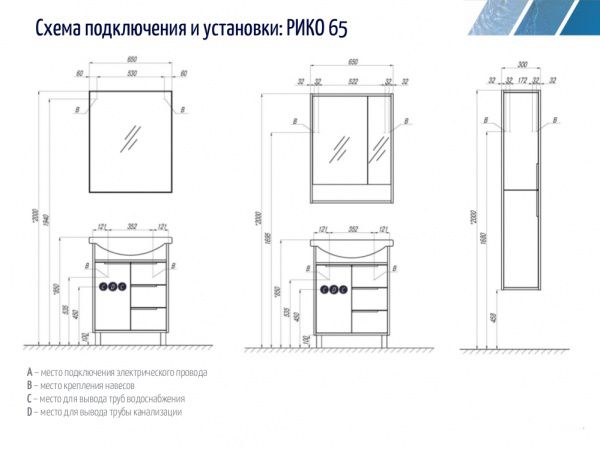 Набор мебели Акватон Рико 65 - ОписаниеС мебелью Рико 65 см нет ничего невозможного: четко выверенный функционал обеспечит идеальный порядок ванной комнате. В состав комплекта входит тумба, раковина, зеркальный шкаф.
