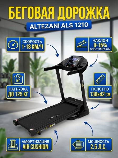 Беговая дорожка Altezani ALS 1210 - ОписаниеСомневаетесь? - Посмотрите рейтинг ТОП-10 по категории «Домашние беговые дорожки»Электрическая беговая дорожка ALS 1210.