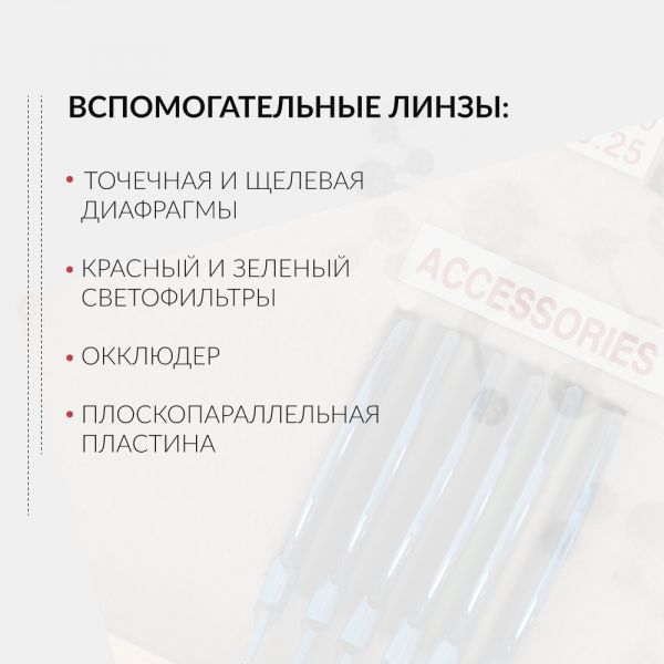 | | Вспомогательные линзы: | Окклюдер; Точечная диафрагма; Щелевая диафрагма; Красный светофильтр; Зеленый светофильтр; Плоскопараллельная пластина