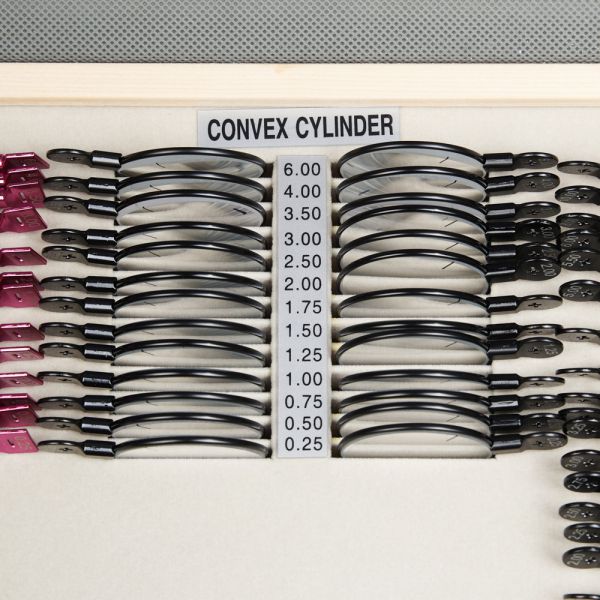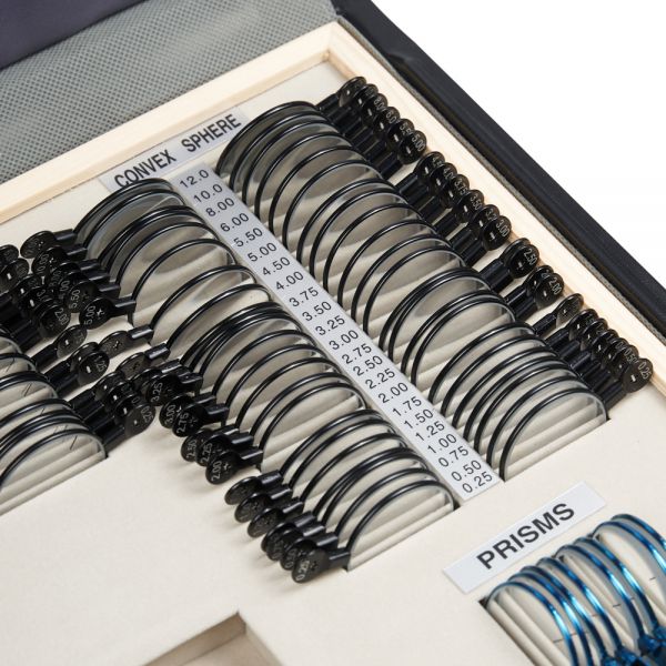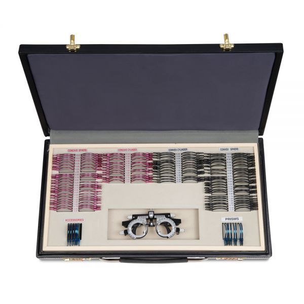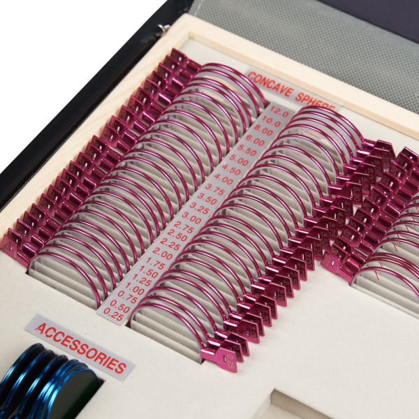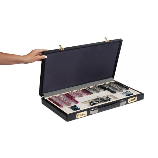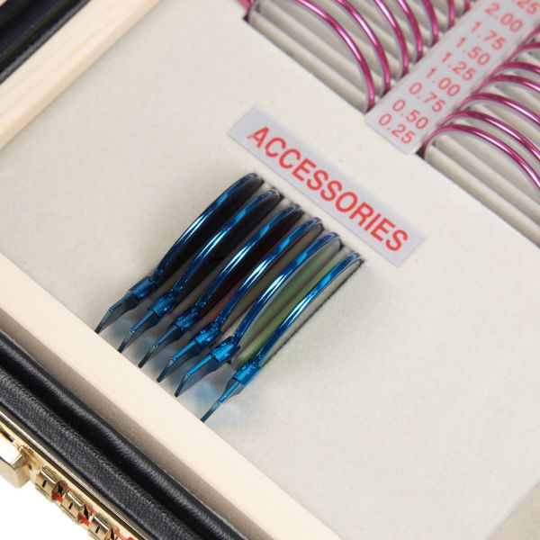 Расширенный набор пробных линз различных типов и оптической силы, позволяющий провести подробную диагностику зрения с подбором очков. Линзы изготовлены из оптического стекла в прочной металлической обойме с обозначением характеристик на рукоятке и вставляются в универсальную пробную оправу, которая используется для обследования зрения.