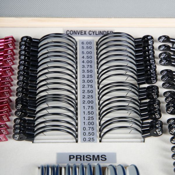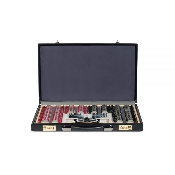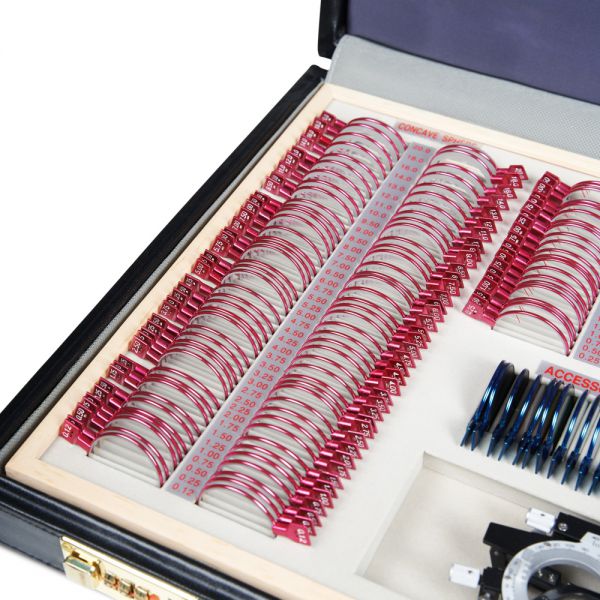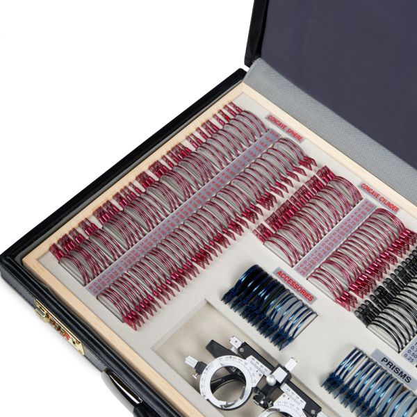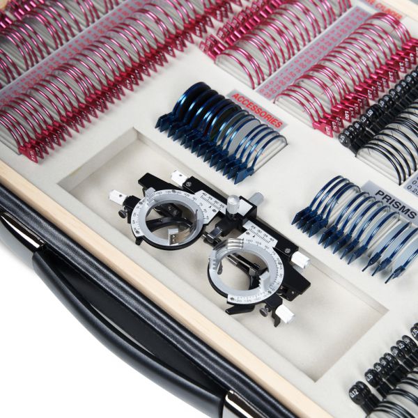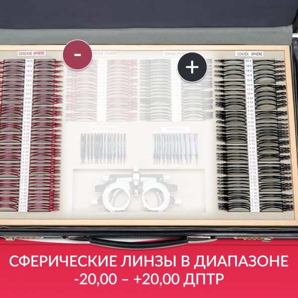 Большой набор пробных линз, позволяющий провести подробную диагностику зрения благодаря широкому диапазону диоптрий и большому выбору вспомогательных линз. Все линзы изготовлены из оптического стекла в прочной металлической обойме с обозначением характеристик на рукоятке и вставляются в универсальную пробную оправу, которая используется для обследования зрения.