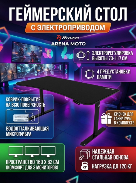 Стол для геймеров с электрорегулировкой Arozzi Arozzi Arena Moto - ОписаниеArena Moto - это моторизованная версия оригинального игрового стола Arena. Сегодня он считается одним из лучших игровых столов на рынке. Теперь простым нажатием кнопки вы можете отрегулировать высоту стола. Ширина стола (160 см) позволяет разместить три монитора для полного погружения в игру, глубина стола позволяет более чем свободно проводить манипуляции мышью, а кроме этого свободно разместить клавиатуру и колонки.