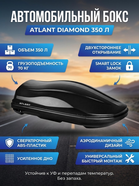 Автомобильный бокс Atlant Diamond 350 л (матовый) - ДоставкаДоставка по Москве: бесплатно, 1-2 дняДоставка по Санкт-Петербургу: бесплатно, 2-3 дня Доставка по России: стоимость уточняйте у оператора. Автомобильный бокс Atlant Diamond 350 л (матовый) - Отзывы0.0