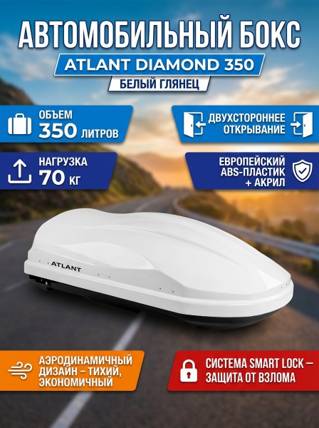 Автомобильный бокс Atlant Diamond 350 л (глянцевый) - ОписаниеАвтомобильный бокс ATLANT Diamond 350 продолжает серию популярных боксов Diamond 430. Благодаря дизайну, багажный бокс обладает великолепными показателями аэродинамики. Это способствует снижению уровня шума и сопротивления воздуха (а значит, расхода топлива).