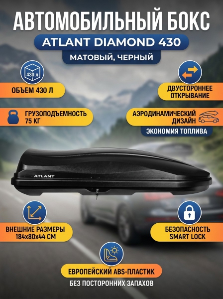 Автомобильный бокс Atlant Diamond 430 л (матовый) - ДоставкаДоставка по Москве: бесплатно, 1-2 дняДоставка по Санкт-Петербургу: бесплатно, 2-3 дня Доставка по России: стоимость уточняйте у оператора. Автомобильный бокс Atlant Diamond 430 л (матовый) - Отзывы0.0