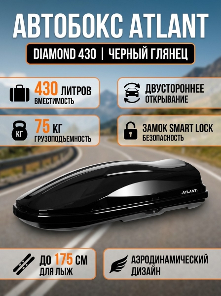 Автомобильный бокс Atlant Diamond 430 л черный глянец - ДоставкаДоставка по Москве: бесплатно, 1-2 дняДоставка по Санкт-Петербургу: бесплатно, 2-3 дня Доставка по России: стоимость уточняйте у оператора. Автомобильный бокс Atlant Diamond 430 л черный глянец - Отзывы0.0