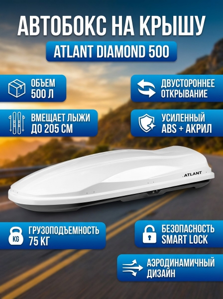 Автомобильный бокс Atlant Diamond 500 л белый глянец - ДоставкаДоставка по Москве: бесплатно, 1-2 дняДоставка по Санкт-Петербургу: бесплатно, 2-3 дня Доставка по России: стоимость уточняйте у оператора. Автомобильный бокс Atlant Diamond 500 л белый глянец - Отзывы0.0