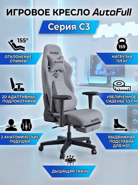 Кресло игровое компьютерное Autofull серия C3, AF083GB, с поддержкой для ног, серый - Обзор ТОП-10 лучших ортопедических кресел 2025 🏆: Обзор и рейтинг