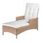 Плетеный шезлонг Azzura Dani Sun 710091 - ОписаниеШезлонг Dani Sun (Дани Сан) выполнен из искусственного ротанга натурального цвета полукруглого плетения. Спинка шезлонга оборудована реклайнер-механизмом, что позволяет изменять ее наклон, а благодаря каркасу из алюминия шезлонг достаточно легкий для свободного перемещения по зоне отдыха. Плетеный шезлонг Dani Sun от компании Azzura привнесет в Ваш отдых на свежем воздухе комфорт и домашний уют. В комплекте мягкая подушка светло-бежевого цвета.