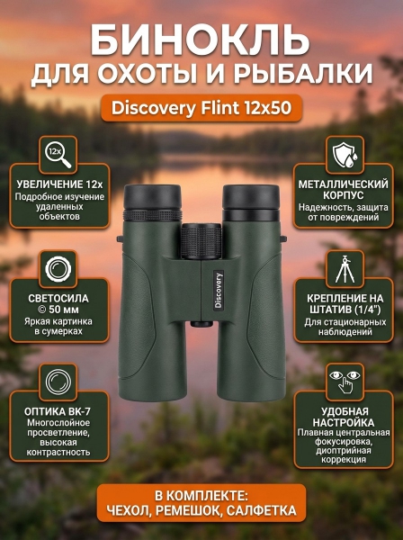 Бинокль для охоты Discovery Flint 12x50 - ДоставкаДоставка по Москве: бесплатно, 1-2 дняДоставка по Санкт-Петербургу: бесплатно, 2-3 дня Доставка по России: стоимость уточняйте у оператора. Бинокль для охоты Discovery Flint 12x50 - Отзывы0.0