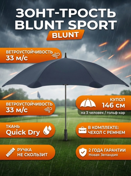 Зонт трость BLUNT Sport Navy синий - ОписаниеНикогда не позволяйте дождю остановить игру. Сильный и спортивный, BLUNT Sport создан для тех, кто по-настоящему любит играть в гольф или выдерживает непогоду на субботних утренних тренировках. Вы полностью защищены, несмотря ни на что. Самый большой зонт в линейке BLUNT, Sport - это зонт во всю длину и с полным покрытием, который поможет вам справиться со стихией. Идеально подходит для того, чтобы вы оставались сухими и в тени на боковых линиях, на лужайках для гольфа и во время любых приключений в промежутках между ними. Спортивный зонт обеспечивает высокую производительность и защиту, которым вы можете доверять. В непогоду он будет предметом зависти толпы, благодаря своей легкой балансировке и модульной конструкции с эластичным стержнем из стекловолокна и эргономичной ручкой. Подходит для дождя, солнца и всего остального. Когда вы закончите, дайте ему высохнуть, а затем положите обратно в специальный чехол для переноски, готовый к следующему приключению. Система индивидуально спроектированных крепежных элементов – рамы, наконечника и козырька – работает в гармонии, создавая высокоэффективную аэродинамическую конструкцию.