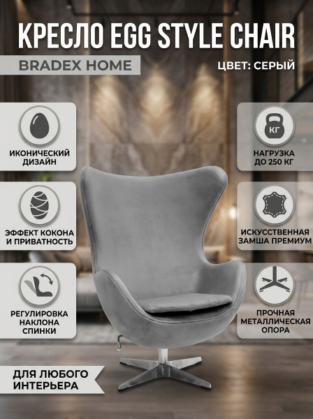 Кресло Bradex Home Egg Style Chair искусственная замша - ОписаниеСомневаетесь? - Посмотрите рейтинг ТОП-10 по категории «Ортопедические кресла»Очертания легендарного кресла Egg напоминают яичную скорлупу неслучайно: благодаря такой необычной форме вы можете комфортно отдохнуть, спрятавшись от посторонних глаз даже в самом многолюдном помещении. Именно поэтому такие кресла нередко можно встретить в холлах и зонах отдыха общественных пространств.