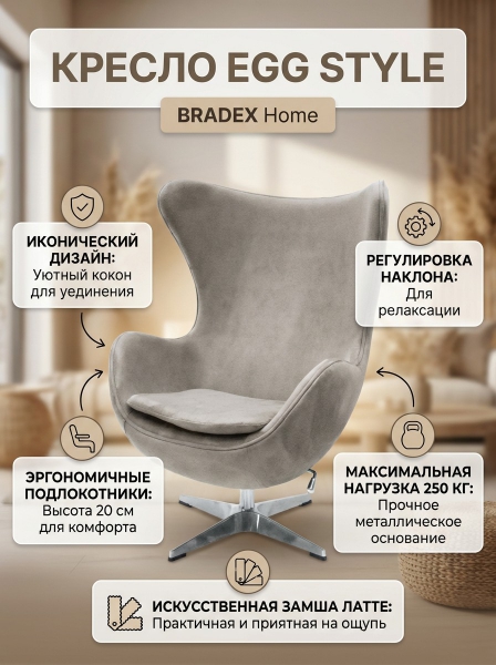 Кресло BRADEX HOME EGG STYLE CHAIR латте, искусственная замша - ДоставкаДоставка по Москве: бесплатно, 1-2 дняДоставка по Санкт-Петербургу: бесплатно, 2-3 дня Доставка по России: стоимость уточняйте у оператора. Кресло BRADEX HOME EGG STYLE CHAIR латте, искусственная замша - Отзывы0.0