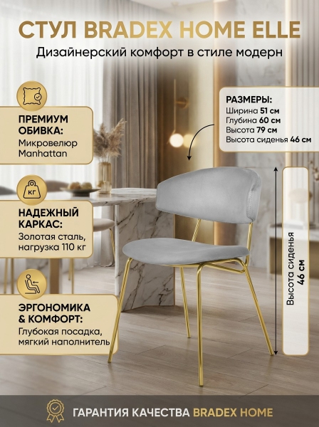 Стул Bradex Home Elle - ОписаниеСтул Elle обладает необычным и стильным дизайном, который привлечет внимание всех гостей Вашего дома. Главная особенность стула - его необычный каркас, выполненный в виде двух металлических стержней, к которым прикреплены мягкие спинка и сиденье, обитые микровелюром Manhattan. Ткань полностью воплощает в себе современные технологии производства, что отличает ее от других трикотажных велюров. Равномерный ворс лицевой поверхности, благодаря переплетению French terry, подчеркнёт достоинства стула. Такой выбор обивки делает стул комфортным и уютным. Ножки стула выполнены из полированной нержавеющей стали с напылением нитрида титана, что создает эффект натурального золота. Это придает стулу элегантный и роскошный вид. Дизайн данной модели идеально подойдет для современных интерьеров, выполненных в стиле модерн или минимализм. За счет своей лаконичности и комфорта в посадке, этот стул станет прекрасным дополнением для гостиной, столовой или спальни.
