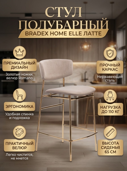 Стул полубарный BRADEX HOME Elle латте с золотыми ножками - ОписаниеПолубарный стул Elle — идеальное решение для кухни. Стул имеет комфортное подножие и удобную высоту, подходящую под стандартные кухонные островки. Стул выполнен в необычном и стильном дизайне, который непременно привлечёт внимание гостей. Велюр обладает высокой плотностью, не мнётся и подходит для всех видов мебели. Его шелковистая поверхность приятна на ощупь, а дополнительный принт придаёт ткани уникальность и глубину.