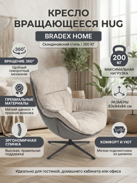 Кресло BRADEX HOME HUG светло-серый, экокожа, шенилл - ОписаниеСомневаетесь? - Посмотрите рейтинг ТОП-10 по категории «Ортопедические кресла»Вращающееся кресло Hug – воплощение комфорта, стиля и элегантности. Это идеальное решение для интерьера, выполненного в скандинавском стиле или стиле минимализм. Эксклюзивная комбинация материалов обивки из приятного на ощупь шенилла на лицевой части и экокожи на задней част придают оригинальность креслу и выделяют его среди других. Кресло Hug имеет эргономичную высокую спинку и состоит из двух мягких частей. Объемная мягкая внутренняя часть для максимального комфорта обита нежным шениллом, обеспечивая максимальный комфорт. Внешняя часть кресла обита прочной экокожей, а устойчивый металлический каркас делают кресло Hug идеальным для больших нагрузок. Кресло Hug - идеальный выбор для интерьера в скандинавском стиле, оно вращается на 360 градусов и может быть дополнено удобной оттоманкой для еще большего комфорта.