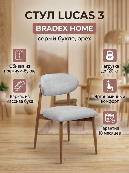 Стул BRADEX HOME Lucas 3 серый букле с ножками цвета орех - БрендСтрана бренда: Россия Премиальность бренда:Стул BRADEX HOME Lucas 3 серый букле с ножками цвета орех - Характеристики