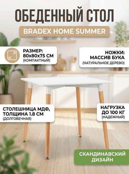 Обеденный стол Bradex Home Summer - ОписаниеКухонный стол Summer имеет квадратную форму и отлично подойдет для любого интерьера. Столешница выполнена из МДФ, что облегчает уход за ней и увеличивает срок использования. Основание обеденного стола металлическое, что делает его прочным и надежным. Ножки из бука сочетаются с классическим, современным и даже скандинавским стилем. Квадратный стол имеет небольшие размеры, поэтому отлично подойдет для компактной кухни в современном лаконичном дизайне.