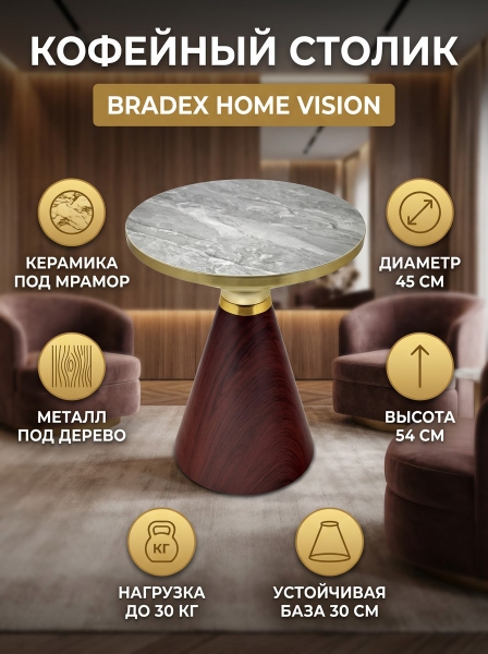 Кофейный столик BRADEX HOME Vision диам.45см x 54см, металл под дерево, керамика - Вопросы по товаруКофейный столик BRADEX HOME Vision диам.45см x 54см, металл под дерево, керамика - ОписаниеVision - это не просто журнальный столик, это настоящий акцент в вашем интерьере. Его изящная форма и стильный дизайн поразят всех гостей и добавят шарма вашему дому. Изготовленный из высококачественного металла, столик Vision обещает быть надежным и долговечным компаньоном в вашем интерьере. Его оригинальная комбинация материалов - основание из керамогранита и ножка из металла с имитацией под дерево выделяет его среди других предметов интерьера. Золотое обрамление по краю основания придает столику винтажный и роскошный вид и делает его идеальным выбором для тех, кто ценит элегантность и стиль. Его круглая форма и компактные размеры делают столик универсальным и позволяют использовать его не только в качестве журнального столика, но и в различных других функциональных целях.