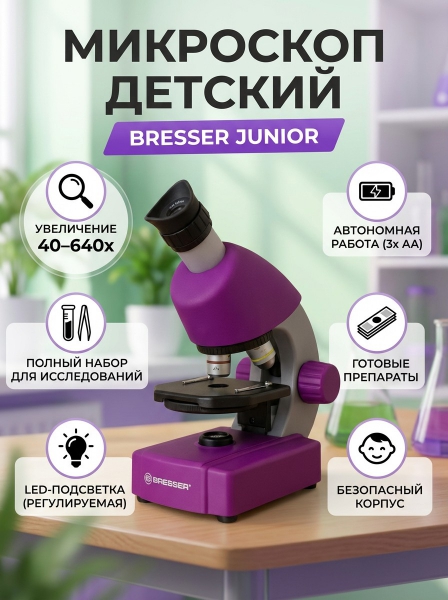 Микроскоп детский Bresser Junior 40x-640x фиолетовый - ОписаниеДетский микроскоп Junior 40x-640x – отличный выбор первого микроскопа для любознательного ребенка. Это яркий и простой в управлении оптический прибор, который надолго увлечет юного исследователя изучением микромира. Маленький ученый сможет исследовать микропрепараты, научится самостоятельно готовить образцы для исследований и проводить увлекательные биологические опыты. Капля воды, листья растений, домашняя пыль, йогурт из холодильника – привычные вещи откроются юному исследователю с необычной стороны. В комплект микроскопа уже входят все необходимые аксессуары, инструменты и микропрепараты.