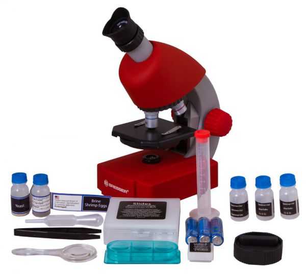 Микроскоп детский Bresser Junior 40x-640x красный - ОписаниеДетский микроскоп Junior 40x-640x – отличный выбор первого микроскопа для любознательного ребенка. Это яркий и простой в управлении оптический прибор, который надолго увлечет юного исследователя изучением микромира. Маленький ученый сможет исследовать микропрепараты, научится самостоятельно готовить образцы для исследований и проводить увлекательные биологические опыты. Капля воды, листья растений, домашняя пыль, йогурт из холодильника – привычные вещи откроются юному исследователю с необычной стороны. В комплект микроскопа уже входят все необходимые аксессуары, инструменты и микропрепараты.