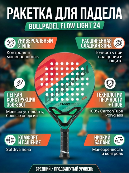 Ракетка для падела Bullpadel FLOW LIGHT 24 - ОписаниеПредназначен для игроков среднего и продвинутого уровня, которым нужен идеальный баланс силы и контроля. Новый дизайн отличается современной и привлекательной эстетикой в сочетании с легкой конструкцией. 350 и 360 грамм, что делает его чрезвычайно простым в обращении. Благодаря своей круглой форме и низкому балансу ракетка обеспечивает универсальность игры, подходит как для мощных, так и для точных ударов.