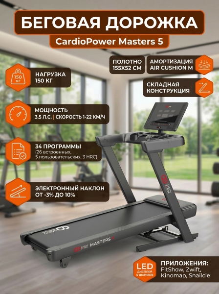 Беговая дорожка CardioPower Masters 5 - ОписаниеСомневаетесь? - Посмотрите рейтинг ТОП-10 по категории «Домашние беговые дорожки»CardioPower Masters 5 — это беговая дорожка с расширенными функциями и просторным полотном, рассчитанная на высокие нагрузки. Оснащена электродвигателем постоянного тока DC, развивает скорость от 1 до 22 км/ч. Модель имеет 34 программы, включая 26 встроенных, 5 пользовательских и 3 HRC. Поддержка приложений FitShow, Zwift, Kinomap и Snailcle добавляет виртуальные маршруты и возможность соревноваться с другими пользователями. Устройство выдерживает максимальный вес пользователя до 150 кг и легко складывается одним касанием.