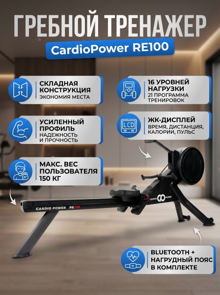 Гребной тренажёр CardioPower RE100 - ОписаниеCardioPower RE100 стильный и технологичный гребной тренажер, собранный из самых качественных материалов. Имеет расширенный программный функционал и обладает самыми современными техническими характеристиками. Данная модель станет настоящим помощником в тренировках и украсит домашний интерьер.