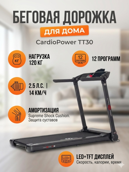 Беговая дорожка CardioPower TT30 - ОписаниеСомневаетесь? - Посмотрите рейтинг ТОП-10 по категории «Домашние беговые дорожки»Беговая дорожка CardioPower TT30 является идеальным выбором для серьезных тренировок в домашних условиях, не уступая по техническим данным беговым дорожкам профессионального уровня.