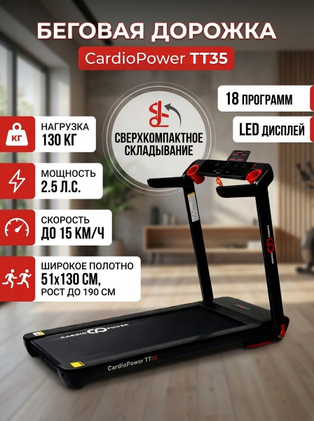 Беговая дорожка CardioPower TT35 - ОписаниеСомневаетесь? - Посмотрите рейтинг ТОП-10 по категории «Домашние беговые дорожки»Беговая дорожка CardioPower TT35 по-настоящему уникальна, благодаря инновационной системе сверхкомпактного складывания, она обладает характеристиками полноразмерной беговой дорожки при этом имея минимальные размеры, сопоставимые с размерами ультра компактных моделей. Стильный, классический дизайн дорожки впишется в любой домашний интерьер.