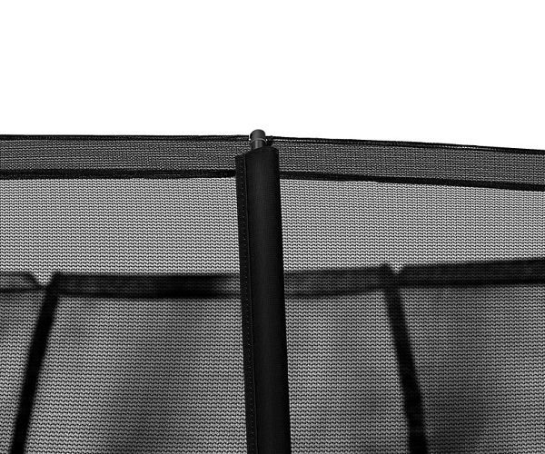 Инновационное крепление защитной сети увеличивает рабочее пространство батута, исключает соприкосновение с пружинным механизмом, все элементы крепления закрыты мягким матом или выполнены из безопасных материалов. Вход на усиленной молнии, оборудован дополнительными фиксаторами (карабинами), защищен от случайного открывания. Нижняя защитная сеть закрывает цокольное пространство под батутом для полной безопасности не только спортсмена, но и окружающих. Материал защитной сети из 100% Polyethylene. На металлические стойки надеты влагозащитные чехлы, внутри мягкий вспененный слой 7.5 мм.