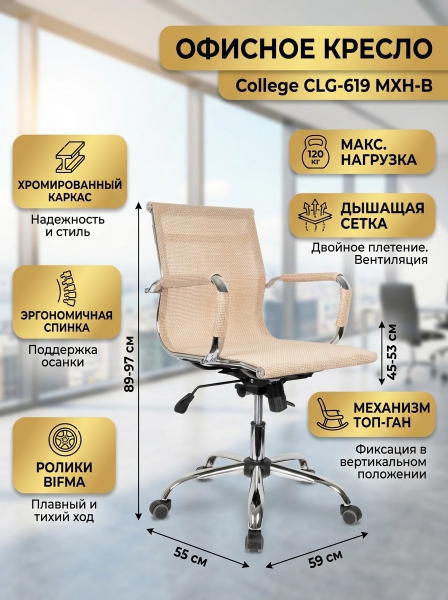 Полимерная сетка двойного плетения обеспечат прекрасный внешний вид кресла при самых интенсивных условиях его эксплуатации. А высокая, с изгибом, спинка, регулятор высоты, регулируемый под вес механизм качания и фиксатор вертикального положения гарантируют все удобства настройки и эксплуатации кресла College CLG-619 MXH-B при любом настроении своего владельца.
