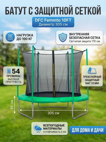 Батут с внутренней защитной сеткой DFC 10FT green - ОписаниеСомневаетесь? - Посмотрите рейтинг ТОП-10 по категории «Детские батуты»Батут с внутренней сеткой DFC Femmto 10FT зелёного цвета - отличный выбор для активного отдыха на свежем воздухе! Максимальный вес пользователя - 100 килограмм, что позволяет использовать батут как взрослым, так и детям. Цвет батута - зелёный, что делает его не только функциональным, но и стильным элементом ландшафтного дизайна.
