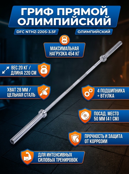 Гриф прямой DFC 220 см д50 - ОписаниеСомневаетесь? - Посмотрите рейтинг ТОП-10 по категории «Грифы для штанги»Гриф прямой DFC NTHZ-220S-3.5F - отличный выбор для силовых тренировок! Он изготовлен из высококачественной хромированной стали, которая гарантирует прочность и долговечность, а его нескользящие насечки обеспечивают надежный хват во время выполнения упражнений.
