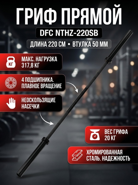 Гриф прямой DFC 220 см д50, чёрный - ОписаниеСомневаетесь? - Посмотрите рейтинг ТОП-10 по категории «Грифы для штанги»Гриф прямой DFC NTHZ-220SB - отличный выбор для силовых тренировок! Изготовлен из высококачественной хромированной стали, которая обеспечивает прочность и долговечность, а его нескользящие насечки гарантируют надежный хват во время выполнения упражнений.