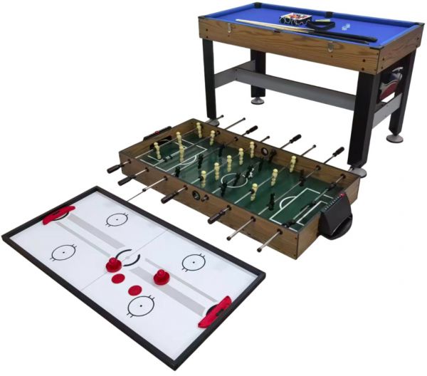 Стол сочетает в себе 4 игровых направления: 1. Бильярд (треугольник, кий, набор шаров, мел) 2. Аэрохоккей (2 биты, шайба) 3. Настольный теннис (2 ракетки, 2 мячика, сетка) 4. Футбол (мяч)