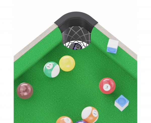 Диаметр шара — 38 мм, длина кия — 107 см, диаметр луз — 70 мм. Все элементы выполнены с точным соблюдением пропорций, что делает игру максимально приближенной к профессиональной.