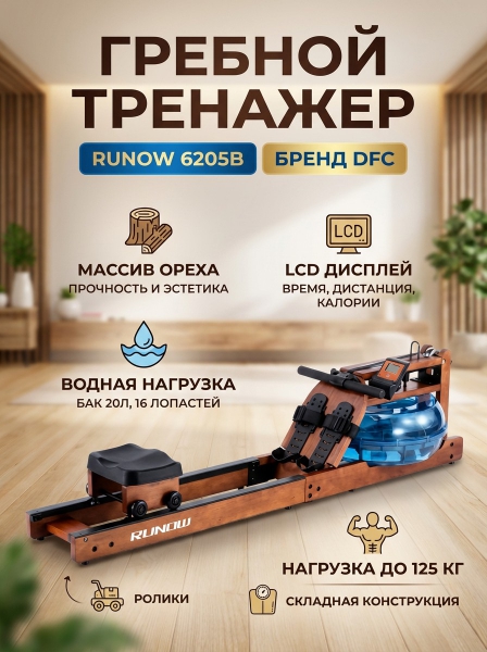 Гребной тренажер DFC 6205B - ОписаниеГребной тренажер DFC Runow 6205B выполнен в цвете грецкий орех и предназначен для пользователей весом до 125 килограмм. Тренажер компактен и может быть установлен вертикально у стены.