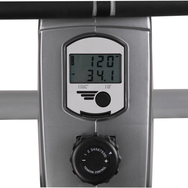 Ручная регулировка нагрузки с помощью рукоятки на стойке тренажера, 10 уровней нагружения. Консоль с LCD-экраном компьютера (питание от 2 батареек тип АА). Показания компьютера: скан, время, гребки/мин, гребки общее, калории.