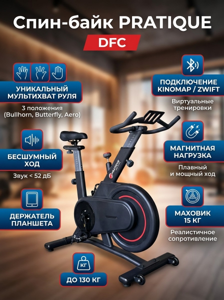 Спин-байк DFC B-Q200B PRATIQUE - ОписаниеСомневаетесь? - Посмотрите рейтинг ТОП-10 по категории «Велотренажеры»Спин-байк DFC PRATIQUE - это отличный выбор для тех, кто хочет проводить эффективные кардио-тренировки у себя дома, имитируя езду на реальном велосипеде. Уникальный комбинированный руль с тремя вариантами хвата (Bullhorn, Butterfly, Aero) и противоскользящим, стойким к поту покрытием гарантирует комфорт и безопасность при тренировке.