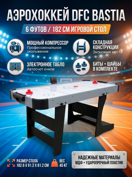 Игровой стол для аэрохоккея DFC Bastia 6 - ДоставкаДоставка по Москве: бесплатно, 1-2 дняДоставка по Санкт-Петербургу: бесплатно, 2-3 дня Доставка по России: стоимость уточняйте у оператора. Игровой стол для аэрохоккея DFC Bastia 6 - Отзывы4.8