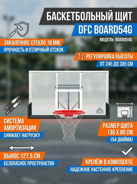 Баскетбольный щит с кольцом DFC BOARD54G - ОписаниеСомневаетесь? - Посмотрите рейтинг ТОП-10 по категории «Баскетбольные щиты»Баскетбольный щит DFC BOARD54G для установки на стену. Щит сделан из закалённого стекла, кольцо R3 оранжевого цвета диаметром 45 см. Вынос щита - 127,5 см вместе с кольцом.