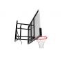 Баскетбольный щит и кольцо имеют стандартные размеры и могут использоваться для полноценной игры и тренировок. Щит выполнен из толстого закаленного стекла и по краям усилен алюминиевым кантом, а кольцо оборудовано двумя амортизаторами. Это позволяет щиту выдерживать большие механические нагрузки.