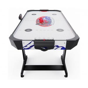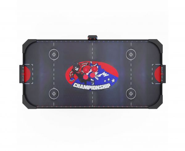 Игровое поле стола выполнено из качественного МДФ с покрытием ПВХ и бумажным слоем, что обеспечивает гладкую поверхность для лёгкого скольжения шайбы и повышает износостойкость конструкции. Толщина поля 3 мм, бортики высотой 25 мм и толщиной 12 мм защищают шайбу от вылета, обеспечивая комфорт и безопасность игры, а высота ножек 71 см делает стол удобным для игроков разного возраста.
