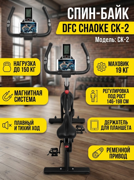 Cпин-байк DFC Chaoke CK-2 - ОписаниеСомневаетесь? - Посмотрите рейтинг ТОП-10 по категории «Велотренажеры»Спин-байк CHAOKE с дисплеем удобнее и тише других. Прочная стальная рама и цельнометаллический маховик весом 19 килограмм обеспечивают устойчивость во время езды на велосипеде. Он выдерживает нагрузку до 150 кг и подходит для пользователей ростом от 146 до 198 см.