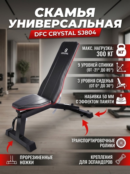 Компания основана в Китае – родине многих организаций, работающих в сфере высоких технологий по производству спортивного оборудования. С 2006 года компания вышла на мировой рынок и получила международный сертификат ISO, подтверждающий безопасность в сфере производства. В ассортименте фирмы вы найдете тренажеры, спортивные аксессуары, массажеры и лимфодренажные аппараты, аспираторы, приборы массажного давления и многое другое. Цель компании – сделать мир лучше и красивее с помощью собственной продукции! Страна бренда: Россия Премиальность бренда:Скамья универсальная DFC CRYSTAL SJ804 - Характеристики