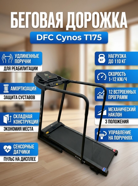 Беговая дорожка для реабилитации DFC Cynos T175 - ОписаниеСомневаетесь? - Посмотрите рейтинг ТОП-10 по категории «Домашние беговые дорожки»CYNOS — электрическая беговая дорожка чёрного цвета для домашнего применения и использования в спортивных и реабилитационных целях. Модель отличается присутствием в комплектации специальных удлинённых поручней для реабилитационных занятий, возможностью регулировки наклона бегового полотна в трёх положениях.