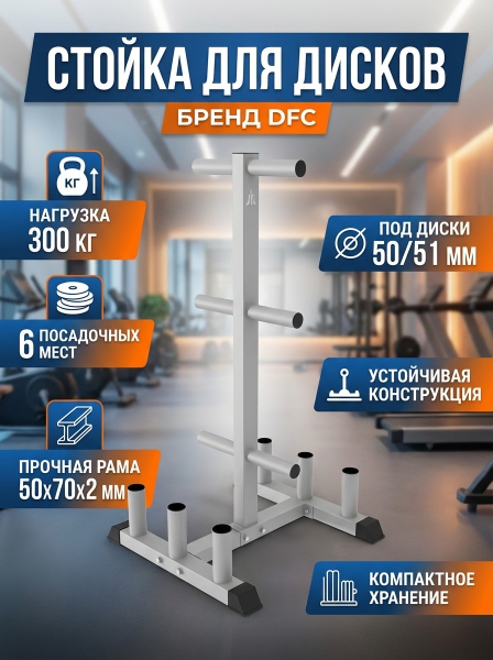 Стойка для хранения дисков 50/51 мм DFC D100897 - ОписаниеСтойка для хранения дисков и грифов DFC D100897 – компактный и удобный аксессуар для организации домашнего спортзала. Все снаряды аккуратно хранятся в одном месте. Стойка выдерживает самую большую нагрузку в серии – до 300 кг. На ней размещается по 6 дисков диаметром 50 и 51 мм. Стойка надежно удерживает снаряды и не опрокидывается. Её можно устанавливать как в отдельном помещении, так и между другими тренажерами и мебелью.