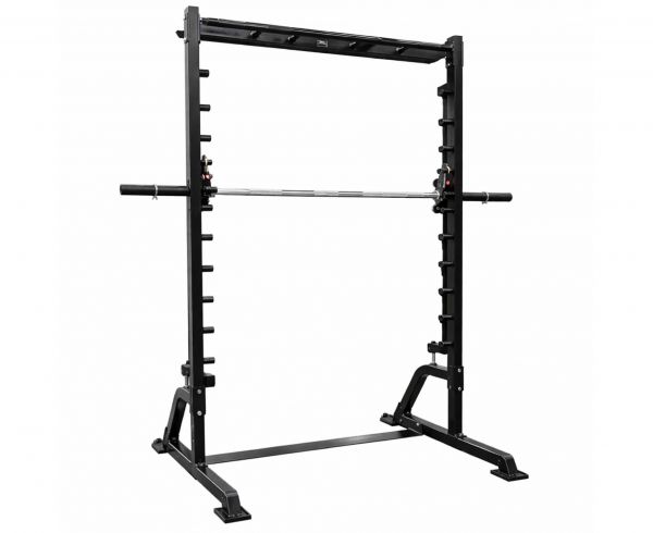 Машина Смита представляет собой силовой тренажёр с массивной стальной рамой чёрного цвета, предназначенный для безопасных и эффективных тренировок. Конструкция выполнена в виде устойчивой прямоугольной рамы с двумя основными вертикальными направляющими, по которым движется гриф, и множеством уровней фиксации по всей высоте стоек, что позволяет устанавливать стартовое и конечное положение штанги на разных уровнях.